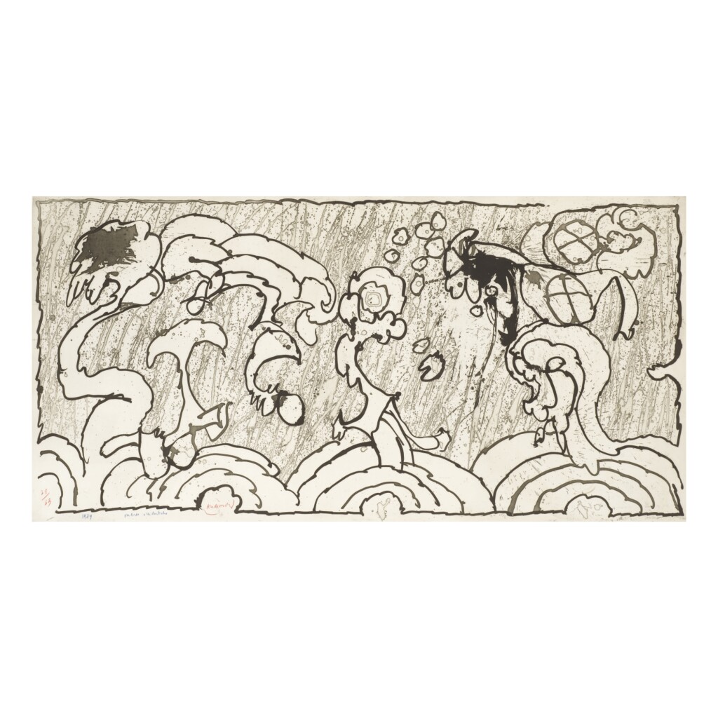 Pierre Alechinsky (°1927, Brussel) is een Belgisch schilder, graficus en schrijver, en een van de laatste levende leden van de Cobra-beweging. Zijn werk wordt gekenmerkt door een vloeiende, kalligrafische lijn, spontane penseelvoering en een grote gevoeligheid voor papier en druktechniek. Alechinsky combineert Westerse schilderkunst met invloeden uit de Japanse kalligrafie en Chinese rolprenttraditie, wat resulteert in composities die tegelijk speels, explosief en poëtisch zijn.